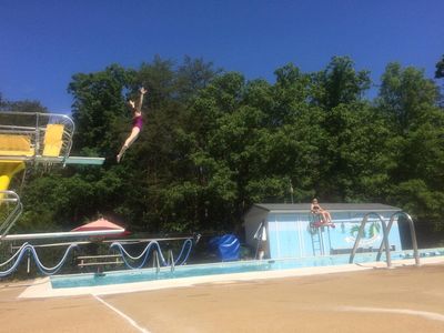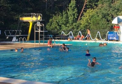 We offer a family friendly pool with large shallow and deep ends, and the only high dive (jumping only) in the Fredericskburg area. Our shallow to deep transition area features five (5) swim lanes that are 25 meters in length. There is also a baby pool available for our smallest guests. A large pool deck with several picnic tables and umbrellas await you, as well as a clubhouse with bathrooms and concessions.